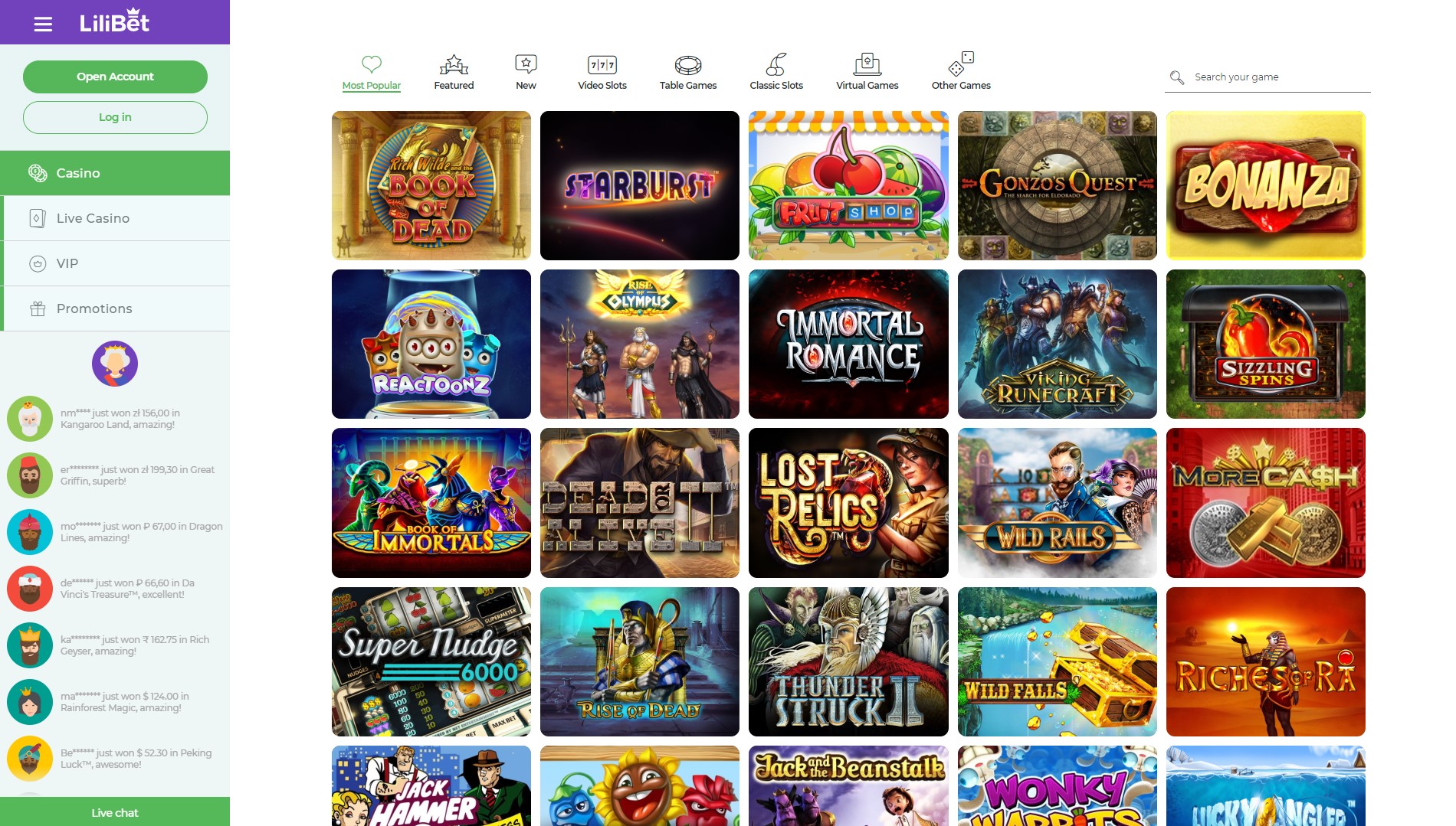 Lilibet Casino tilbyr mer enn 3000 videospill i flere kategorier, fra spilleautomater til live online casino og sportsbetting: